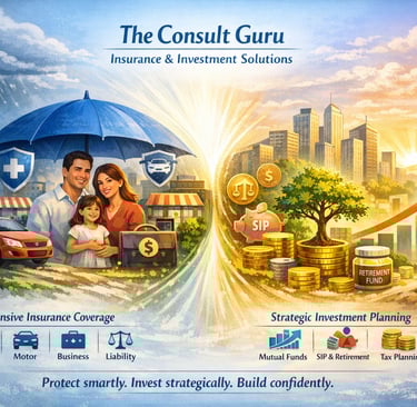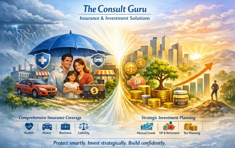 At "The Consult Guru", we believe financial security begins with smart protection and grows with strategic planning. Our integrated Insurance and Investment solutions are designed to safeguard what you’ve built and help you create lasting wealth for the future. We provide comprehensive insurance coverage including Health, Motor, Commercial, Liability, and Business Insurance — ensuring protection against life’s uncertainties.